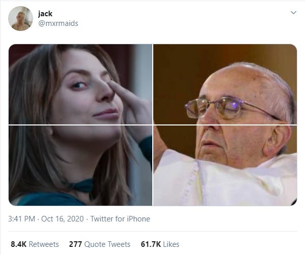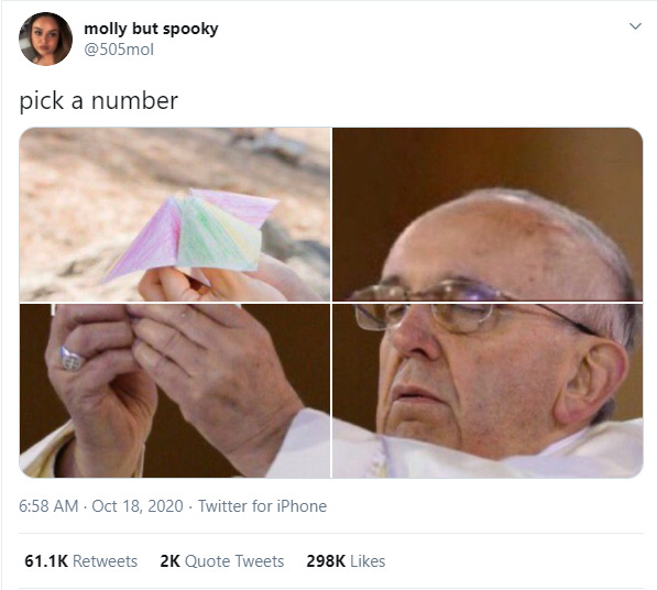 This week the Pope (Francis)made history by saying he supports same-sex civil unions. It’s a groundbreaking shift that pushes the Catholic Church into new territory. The Pope also recently became a meme after people began to use the four picture panels on Twitter to build a composite image of him holding up random things as if blessing them. The original pic of the Pope is from 2013, and he’s holding the Eucharist wafer but if you were on Twitter at all in the past week you probably saw him holding up anything from a PS1 controller to one of those elementary school fortune-tellers.